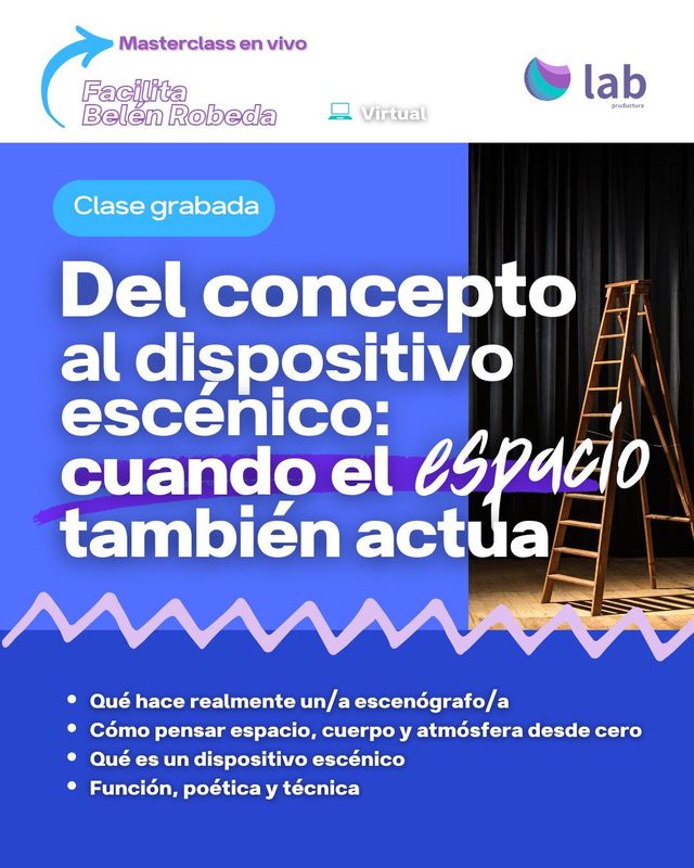 Una masterclass de 2 hs. de duración donde se explora el dispositivo escénico como una herramienta fundamental para pensar el espacio desde la acción. El espacio es entendido aquí como un elemento vivo que dialoga con el cuerpo, la dramaturgia y la atmósfera, y no solo como un fondo o contenedor de la escena.