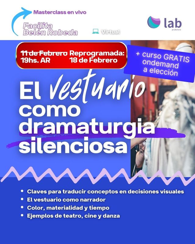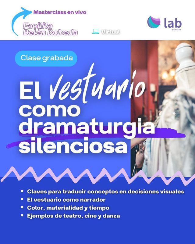 Una masterclass de 2 hs. de duración donde se explora el vestuario como un dispositivo narrativo y poético. Se abordará su relación con el cuerpo, el tiempo y la materialidad, entendiendo al vestuario no solo como estética, sino como dramaturgia silenciosa que acompaña y potencia la escena.